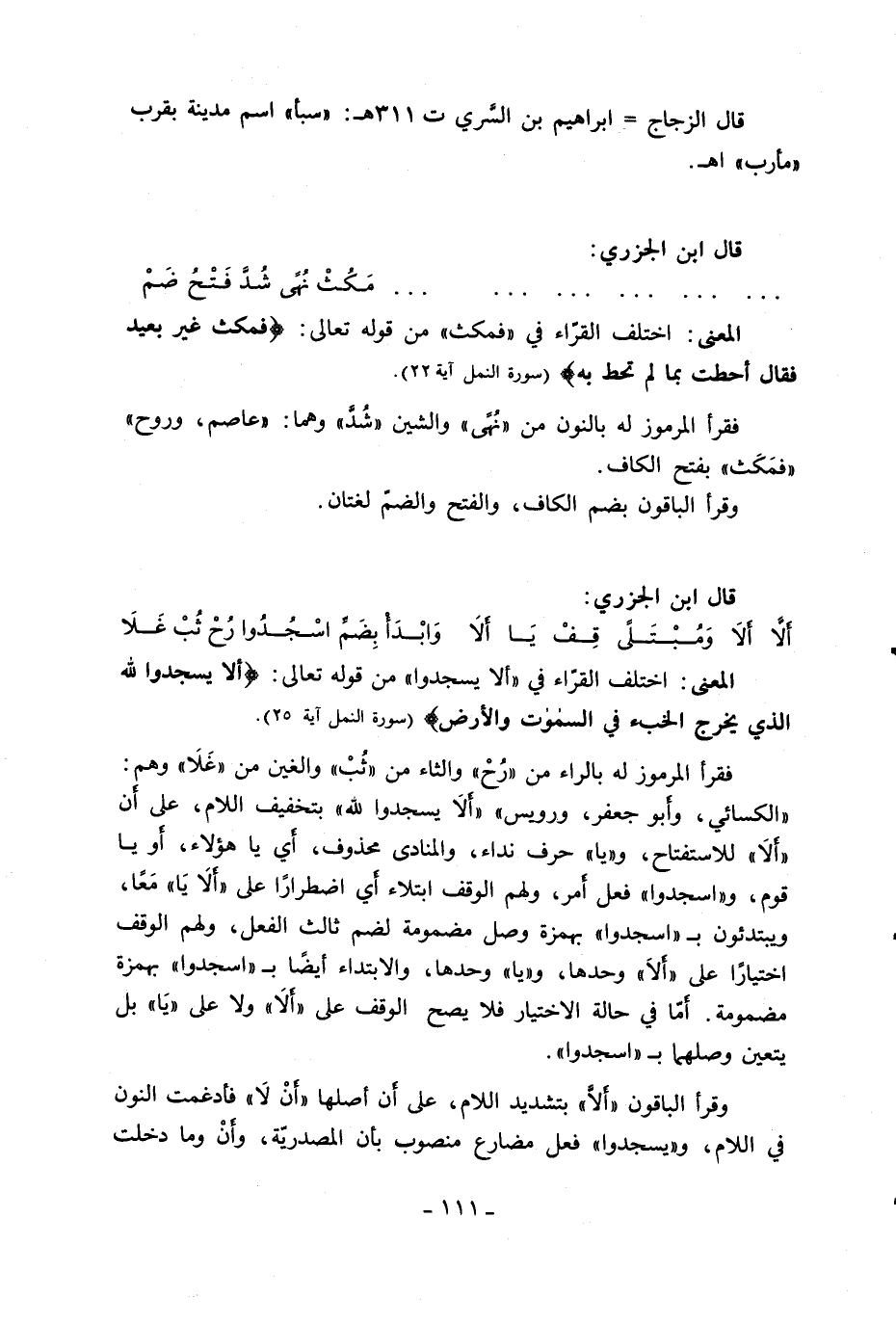 المعنى: اختلف القرّاء في «ألا يسجدوا» من قوله تعالى: أَلَّا يَسْجُدُوا لِلَّهِ الَّذِي يُخْرِجُ الْخَبْءَ فِي السَّماواتِ وَالْأَرْضِ (سورة النمل آية 25).