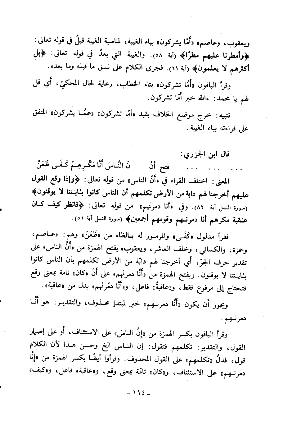 المعنى: اختلف القرّاء في «أنّ الناس» من قوله تعالى: وَإِذا وَقَعَ الْقَوْلُ عَلَيْهِمْ أَخْرَجْنا لَهُمْ دَابَّةً مِنَ الْأَرْضِ تُكَلِّمُهُمْ أَنَّ النَّاسَ كانُوا بِآياتِنا لا يُوقِنُونَ (سورة النمل آية 82). وفي «أنا دمرنهم» من قوله تعالى: فَانْظُرْ كَيْفَ كانَ عاقِبَةُ مَكْرِهِمْ أَنَّا دَمَّرْناهُمْ وَقَوْمَهُمْ أَجْمَعِينَ (سورة النمل آية 51).