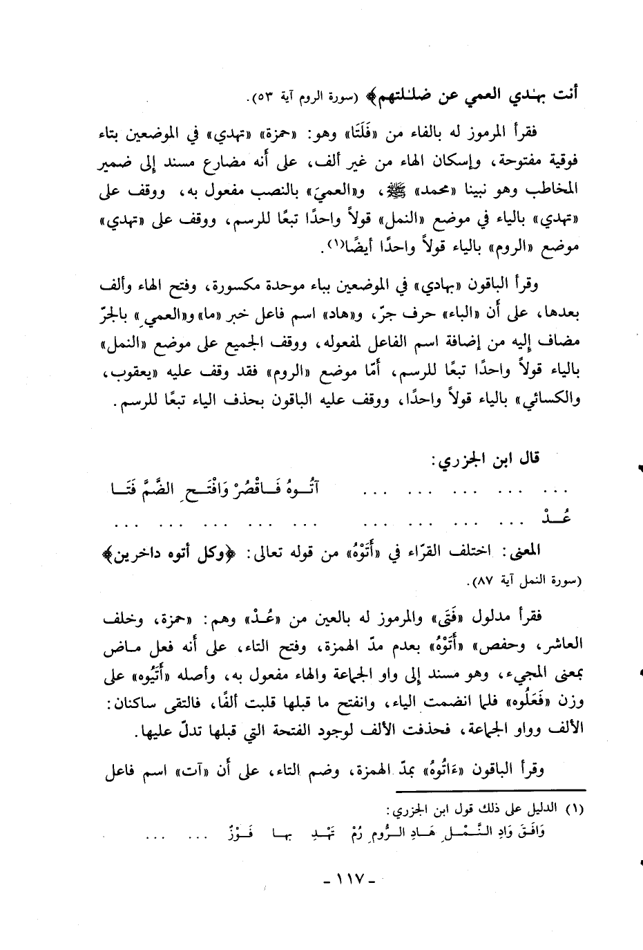 فقرأ المرموز له بالفاء من «فلتا» وهو: «حمزة» «تهدي» في الموضعين بتاء فوقية مفتوحة، وإسكان الهاء من غير ألف، على أنه مضارع مسند إلى ضمير المخاطب وهو نبينا «محمد» صلى الله عليه وسلم، و «العمي» بالنصب مفعول به، ووقف على «تهدي» بالياء في موضع «النمل» قولا واحدا تبعا للرسم، ووقف على «تهدي» موضع «الروم» بالياء قولا واحدا أيضا «1».