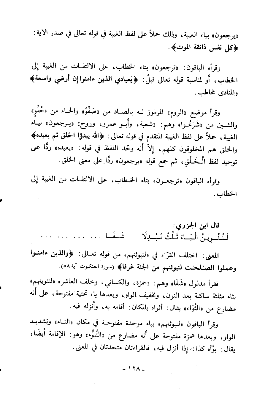 وقرأ موضع «الروم» المرموز له بالصاد من «صفو» والحاء من «حلو» والشين من «شرعوا» وهم: «شعبة، وأبو عمرو، وروح» «يرجعون» بياء الغيبة، حملا على لفظ الغيبة المتقدم في قوله تعالى: اللَّهُ يَبْدَؤُا الْخَلْقَ ثُمَّ يُعِيدُهُ والخلق هم المخلوقون كلهم، إلّا أنه وحّد اللفظ في قوله: «يعيده» ردّا على توحيد لفظ الخلق، ثم جمع قوله «يرجعون» ردّا على معنى الخلق.
