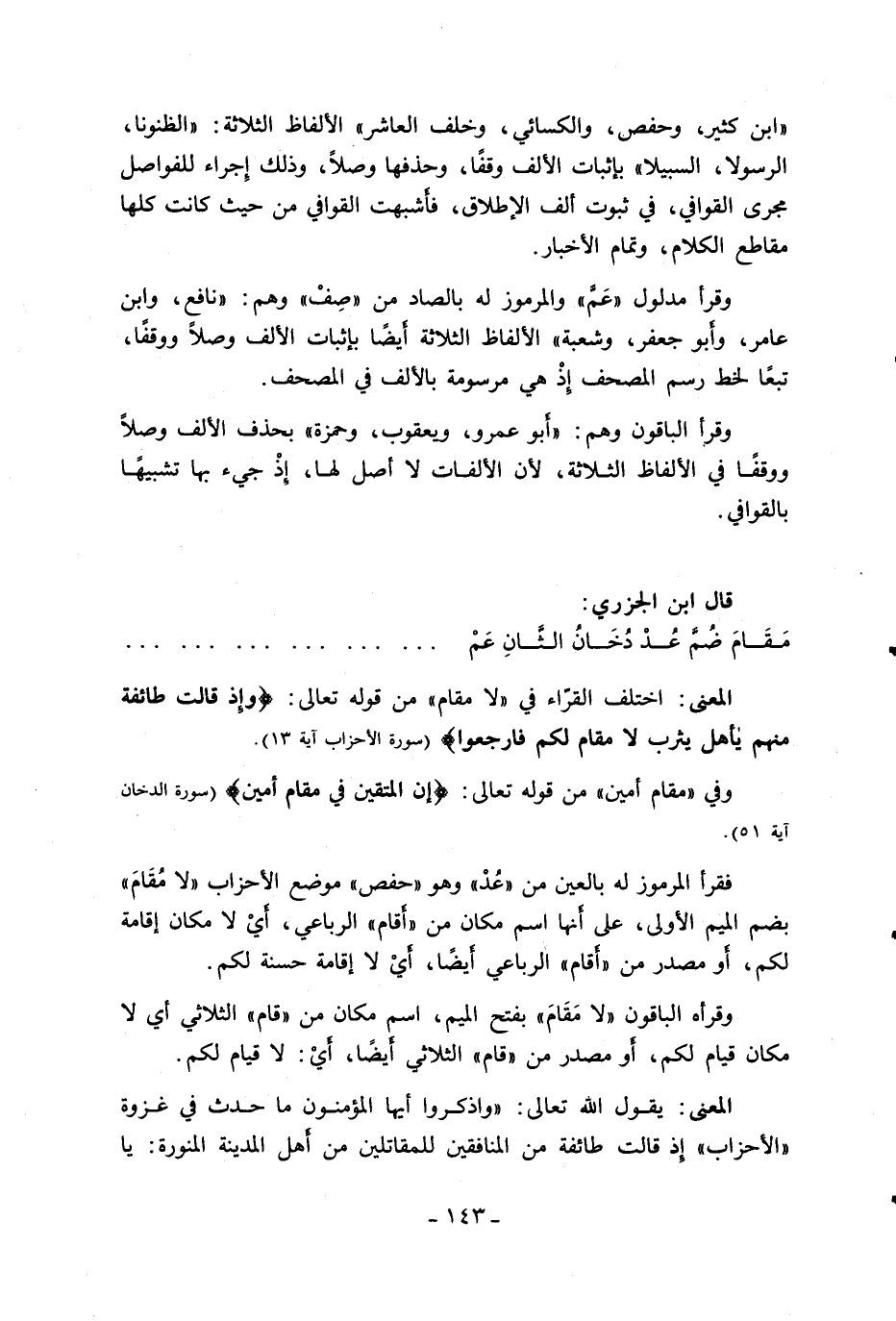 وقرأ مدلول «عمّ» والمرموز له بالصاد من «صف» وهم: «نافع، وابن عامر، وأبو جعفر، وشعبة» الألفاظ الثلاثة أيضا بإثبات الألف وصلا ووقفا، تبعا لخط رسم المصحف إذ هي مرسومة بالألف في المصحف.