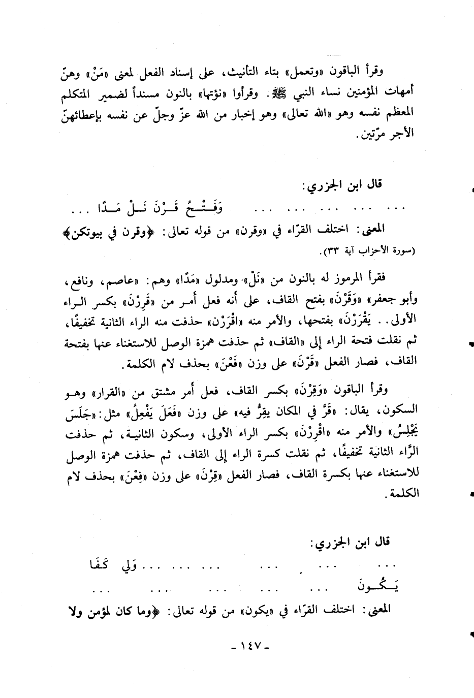 وقرأ الباقون «وقرن» بكسر القاف، فعل أمر مشتق من «القرار» وهو السكون، يقال: «قرّ في المكان يقرّ فيه» على وزن «فعل يفعل» مثل: «جلس يجلس» والأمر منه «اقررن» بكسر الراء الأولى، وسكون الثانية، ثم حذفت الرّاء الثانية تخفيفا، ثم نقلت كسرة الراء إلى القاف، ثم حذفت همزة الوصل للاستغناء عنها بكسرة القاف، فصار الفعل «قرن» على وزن «فعن» بحذف لام الكلمة.