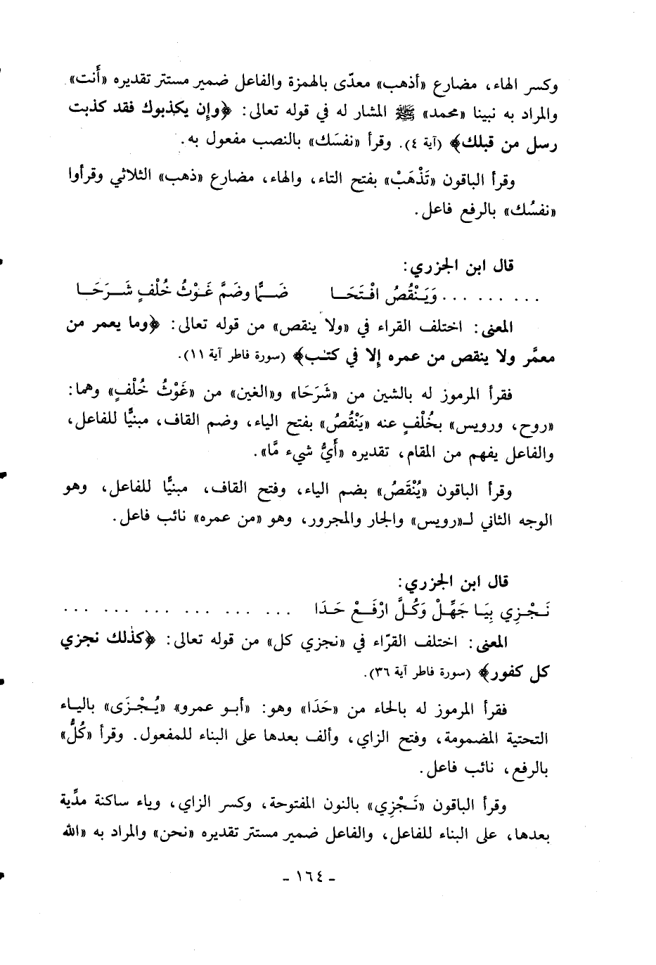 المعنى: اختلف القرّاء في «ولا ينقص» من قوله تعالى: وَما يُعَمَّرُ مِنْ مُعَمَّرٍ وَلا يُنْقَصُ مِنْ عُمُرِهِ إِلَّا فِي كِتابٍ (سورة فاطر آية 11).