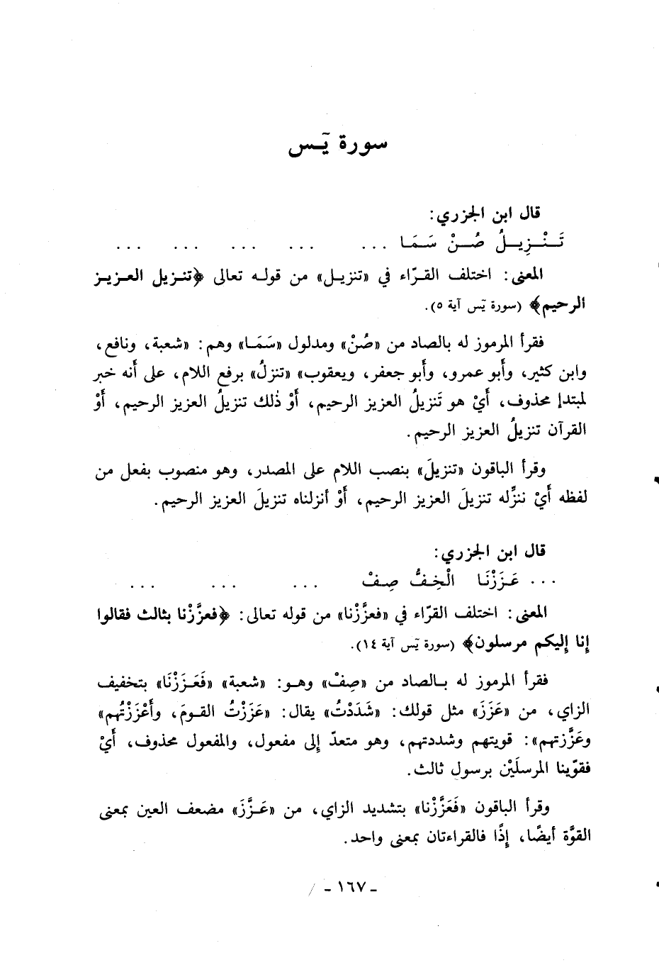 فقرأ المرموز له بالصاد من «صف» وهو: «شعبة» «فعززنا» بتخفيف الزاي، من «عزز» مثل قولك: «شددت» يقال: «عززت القوم، وأعززتهم» وعزّزتهم»: قويتهم وشددتهم، وهو متعدّ إلى مفعول، والمفعول محذوف، أي فقوّينا المرسلين برسول ثالث.