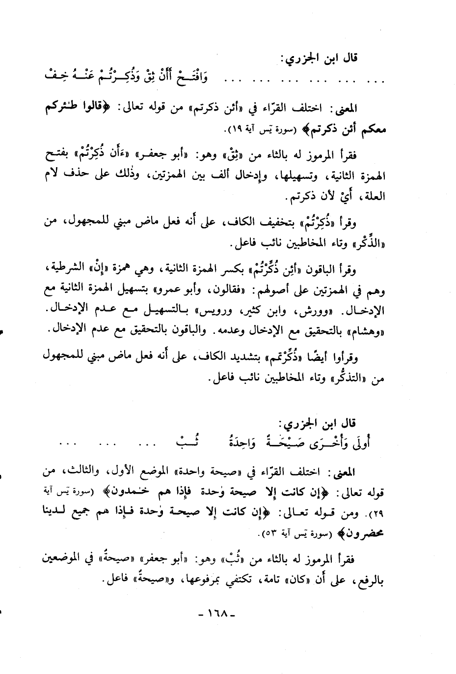 فقرأ المرموز له بالثاء من «ثب» وهو: «أبو جعفر» «صيحة» في الموضعين بالرفع، على أن «كان» تامة، تكتفي بمرفوعها، و «صيحة» فاعل.