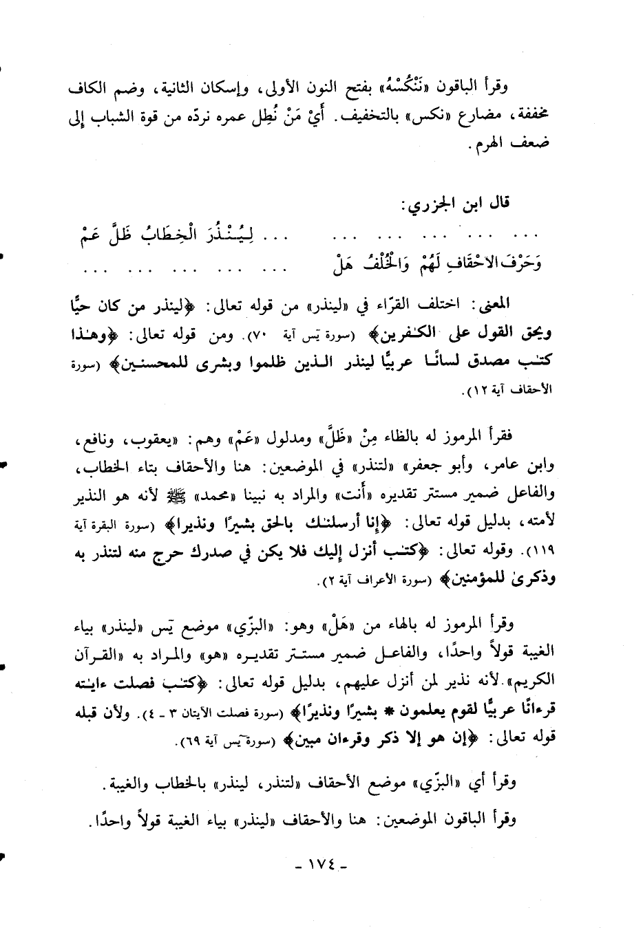 المعنى: اختلف القرّاء في «لينذر» من قوله تعالى: لِيُنْذِرَ مَنْ كانَ حَيًّا وَيَحِقَّ الْقَوْلُ عَلَى الْكافِرِينَ (سورة يس آية 70). ومن قوله تعالى: وَهذا كِتابٌ مُصَدِّقٌ لِساناً عَرَبِيًّا لِيُنْذِرَ الَّذِينَ ظَلَمُوا وَبُشْرى لِلْمُحْسِنِينَ (سورة الأحقاف آية 12).