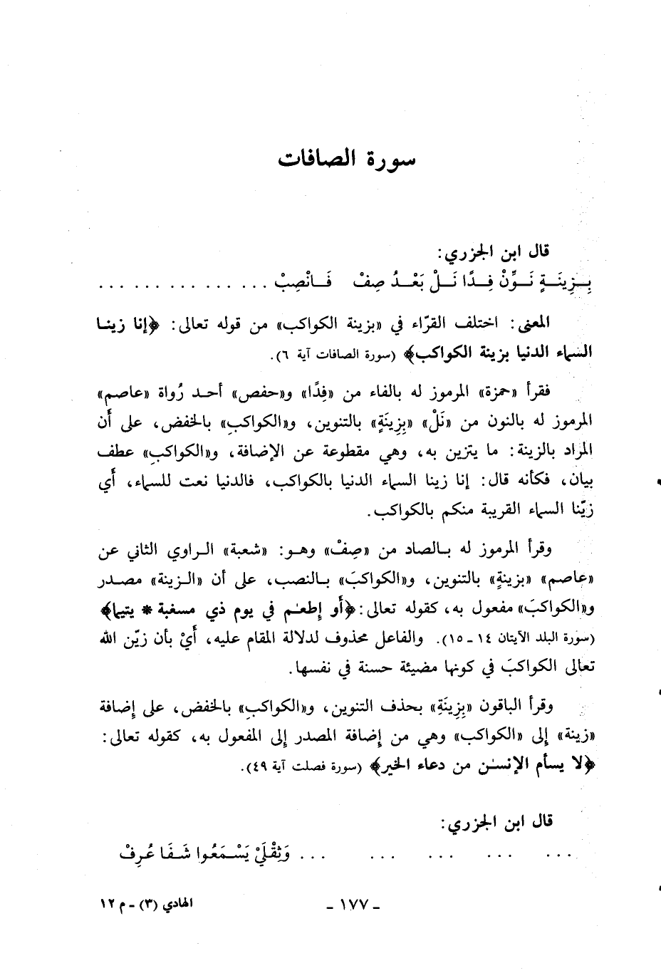 فقرأ «حمزة» المرموز له بالفاء من «فدا» و «حفص» أحد رواة «عاصم» المرموز له بالنون من «نل» «بزينة» بالتنوين، و «الكواكب» بالخفض، على أن المراد بالزينة: ما يتزين به، وهي مقطوعة عن الإضافة، و «الكواكب» عطف بيان، فكأنه قال: إنا زينا السماء الدنيا بالكواكب، فالدنيا نعت للسماء، أي زيّنا السماء القريبة منكم بالكواكب.