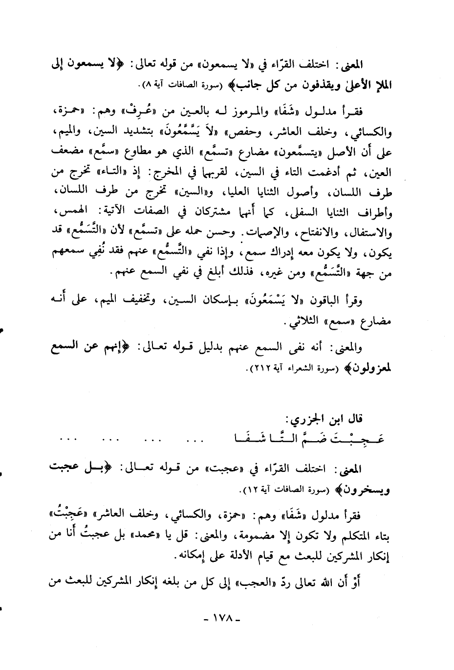 فقرأ مدلول «شفا» والمرموز له بالعين من «عرف» وهم: «حمزة، والكسائي، وخلف العاشر، وحفص» «لا يسّمّعون» بتشديد السين، والميم، على أن الأصل «يتسمّعون» مضارع «تسمّع» الذي هو مطاوع «سمّع» مضعف العين، ثم أدغمت التاء في السين، لقربهما في المخرج: إذ «التاء» تخرج من طرف اللسان، وأصول الثنايا العليا، و «السين» تخرج من طرف اللسان، وأطراف الثنايا السفلى، كما أنهما مشتركان في الصفات الآتية: الهمس، والاستفال، والانفتاح، والإصمات. وحسن حمله على «تسمّع» لأن «التّسمّع» قد يكون، ولا يكون معه إدراك سمع، وإذا نفي «التّسمّع» عنهم فقد نفي سمعهم من جهة «التّسمّع» ومن غيره، فذلك أبلغ في نفي السمع عنهم.