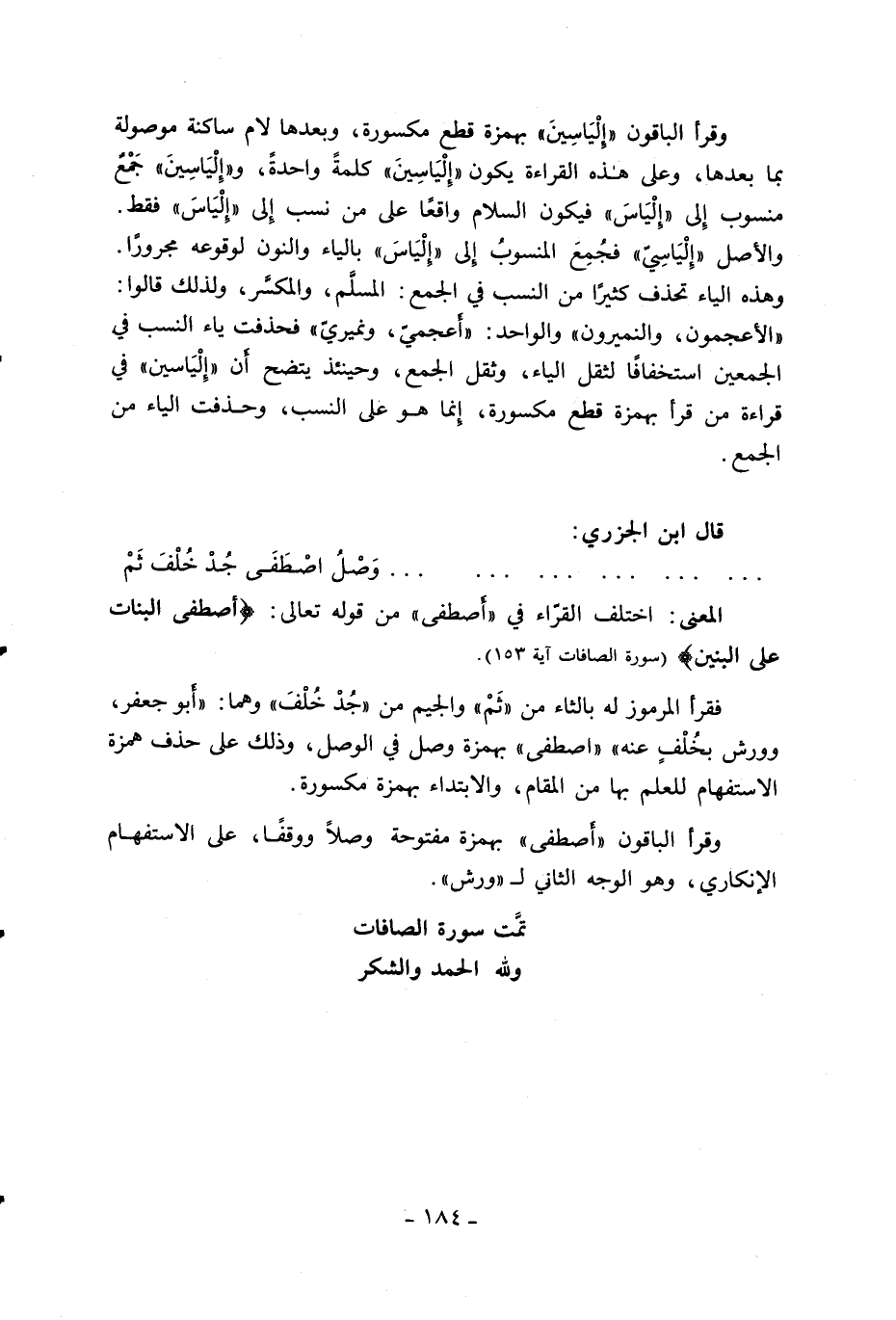 «الأعجمون، والنميرون» والواحد: «أعجميّ، ونميريّ» فحذفت ياء النسب في الجمعين استخفافا لثقل الياء، وثقل الجمع، وحينئذ يتضح أن «إلياسين» في قراءة من قرأ بهمزة قطع مكسورة، إنما هو على النسب، وحذفت الياء من الجمع.