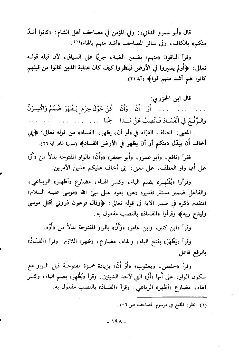 وقرأ «حفص، ويعقوب» «أو أن» بزيادة همزة مفتوحة قبل الواو مع سكون الواو، على أنها «أو» التي لأحد الشيئين. وقرآ «يظهر» بضم الياء، وكسر الهاء، مضارع «أظهر» الرباعي. وقرأ «الفساد» بالنصب مفعول به.