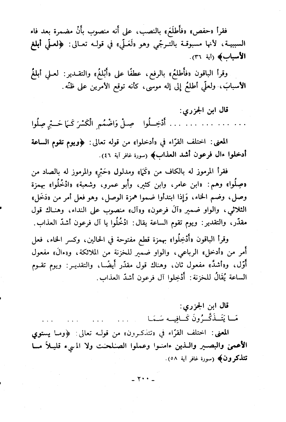 فقرأ المرموز له بالكاف من «كما» ومدلول «حبر» والمرموز له بالصاد من «صلوا» وهم: «ابن عامر، وابن كثير، وأبو عمرو، وشعبة» «ادخلوا» بهمزة وصل، وضم الخاء، وإذا ابتدءوا ضموا همزة الوصل، وهو فعل أمر من «دخل» الثلاثي، والواو ضمير «آل فرعون» و «آل» منصوب على النداء، وهناك قول مقدّر، والتقدير: ويوم تقوم الساعة يقال: ادخلوا يا آل فرعون أشدّ العذاب.