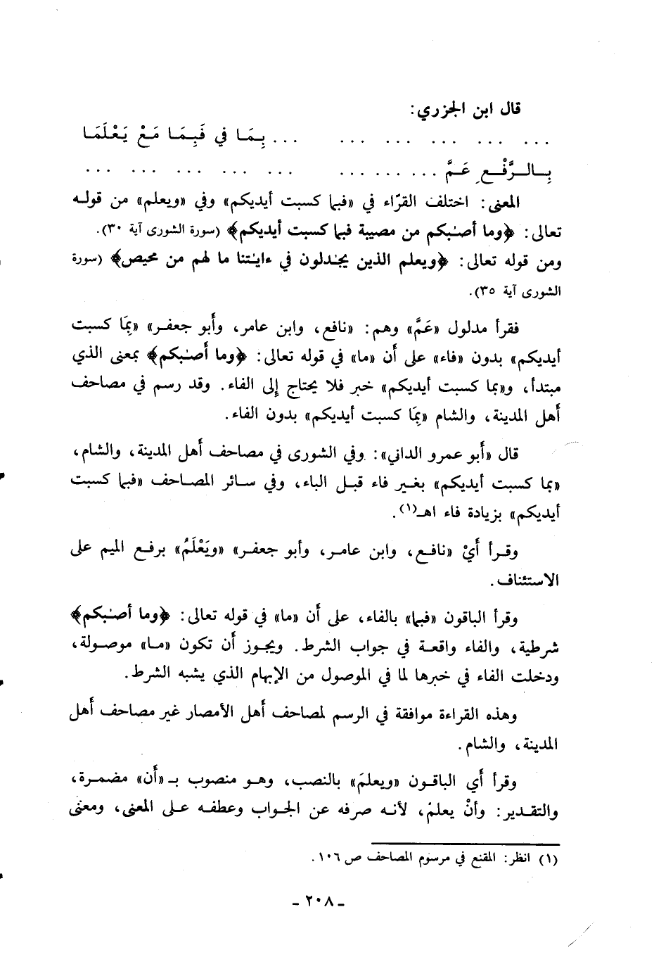 قال «أبو عمرو الداني»: وفي الشورى في مصاحف أهل المدينة، والشام، «بما كسبت أيديكم» بغير فاء قبل الباء، وفي سائر المصاحف «فبما كسبت أيديكم» بزيادة فاء اهـ «1».