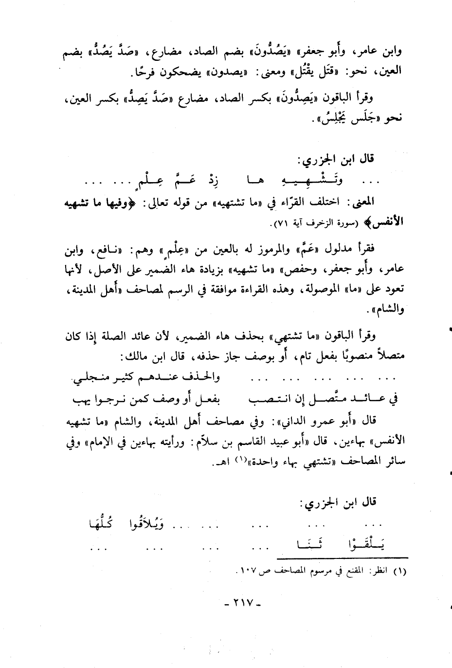 قال «أبو عمرو الداني»: وفي مصاحف أهل المدينة، والشام «ما تشهيه الأنفس» بهاءين، قال «أبو عبيد القاسم بن سلّام: ورأيته بهاءين في الإمام» وفي سائر المصاحف «تشتهي بهاء واحدة» «1» اهـ.