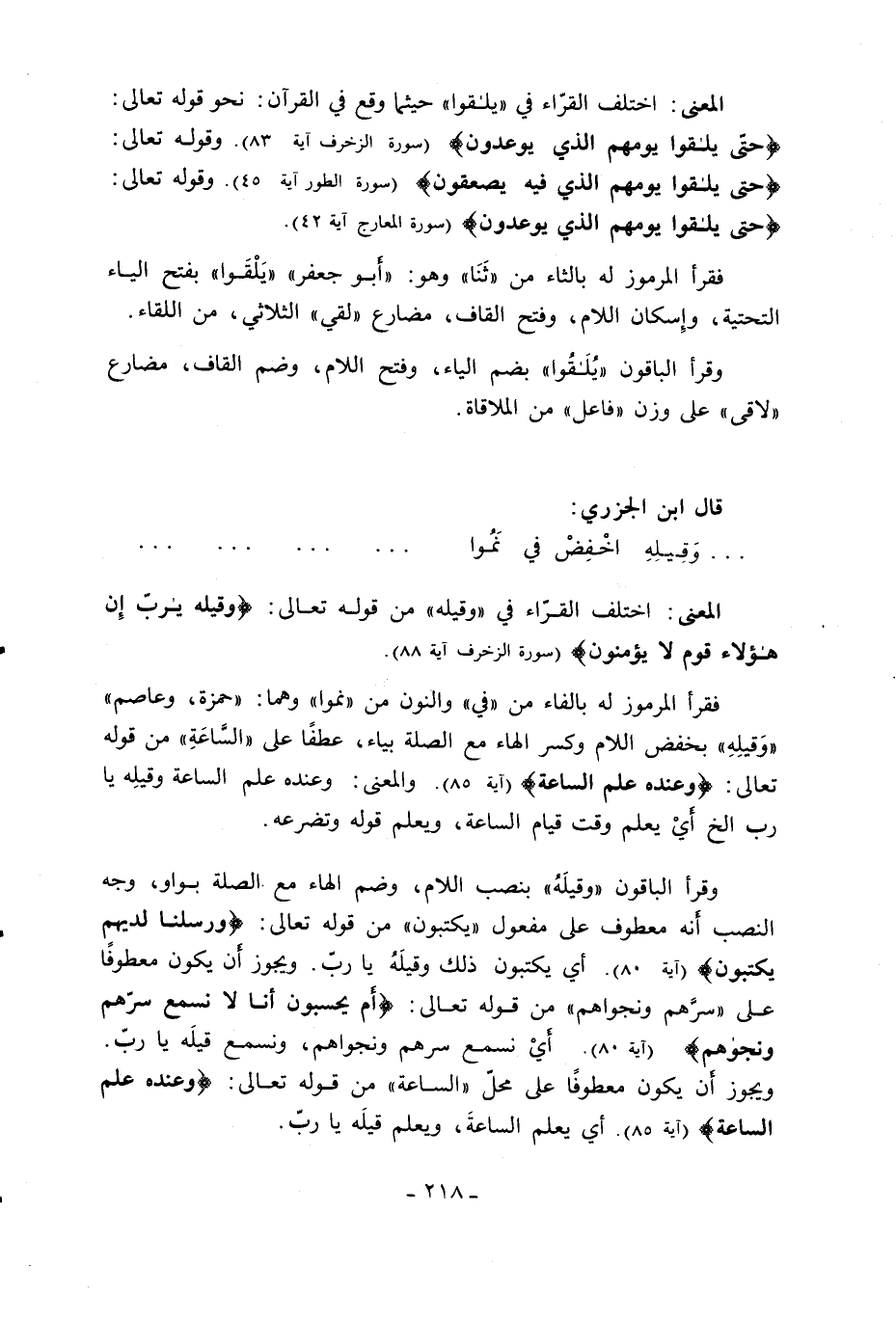 المعنى: اختلف القرّاء في «وقيله» من قوله تعالى: وَقِيلِهِ يا رَبِّ إِنَّ هؤُلاءِ قَوْمٌ لا يُؤْمِنُونَ (سورة الزخرف آية 88).