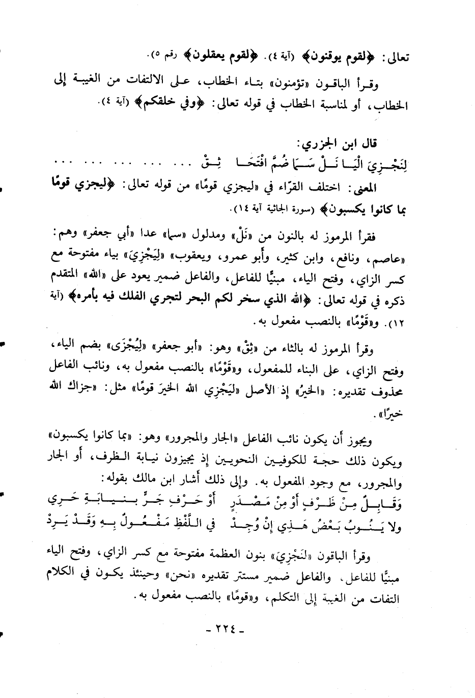 «عاصم، ونافع، وابن كثير، وأبو عمرو، ويعقوب» «ليجزي» بياء مفتوحة مع كسر الزاي، وفتح الياء، مبنيّا للفاعل، والفاعل ضمير يعود على «الله» المتقدم ذكره في قوله تعالى: اللَّهُ الَّذِي سَخَّرَ لَكُمُ الْبَحْرَ لِتَجْرِيَ الْفُلْكُ فِيهِ بِأَمْرِهِ (آية 12). و «قوما» بالنصب مفعول به.