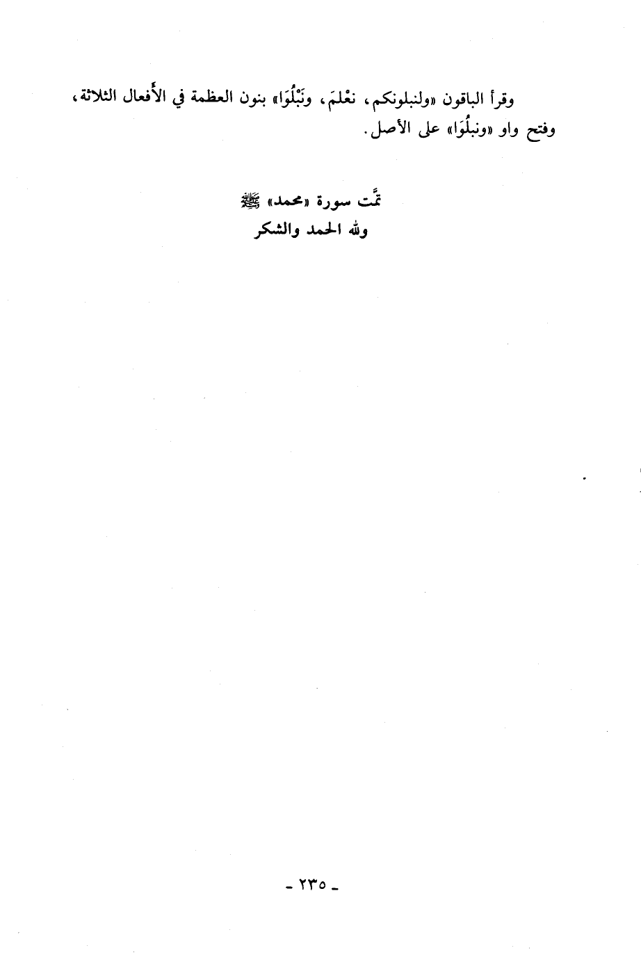 وقرأ الباقون «ولنبلونكم، نعلم، ونبلوا» بنون العظمة في الأفعال الثلاثة، وفتح واو «ونبلوا» على الأصل.