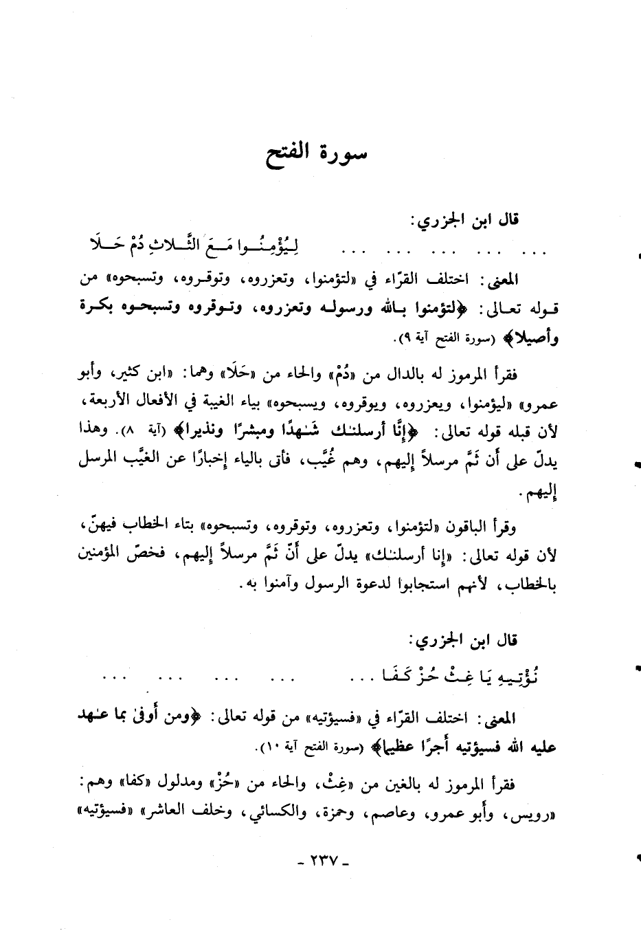 فقرأ المرموز له بالدال من «دم» والحاء من «حلا» وهما: «ابن كثير، وأبو عمرو» «ليؤمنوا، ويعزروه، ويوقروه، ويسبحوه» بياء الغيبة في الأفعال الأربعة، لأن قبله قوله تعالى: إِنَّا أَرْسَلْناكَ شاهِداً وَمُبَشِّراً وَنَذِيراً (آية 8). وهذا يدلّ على أن ثمّ مرسلا إليهم، وهم غيّب، فأتى بالياء إخبارا عن الغيّب المرسل إليهم.