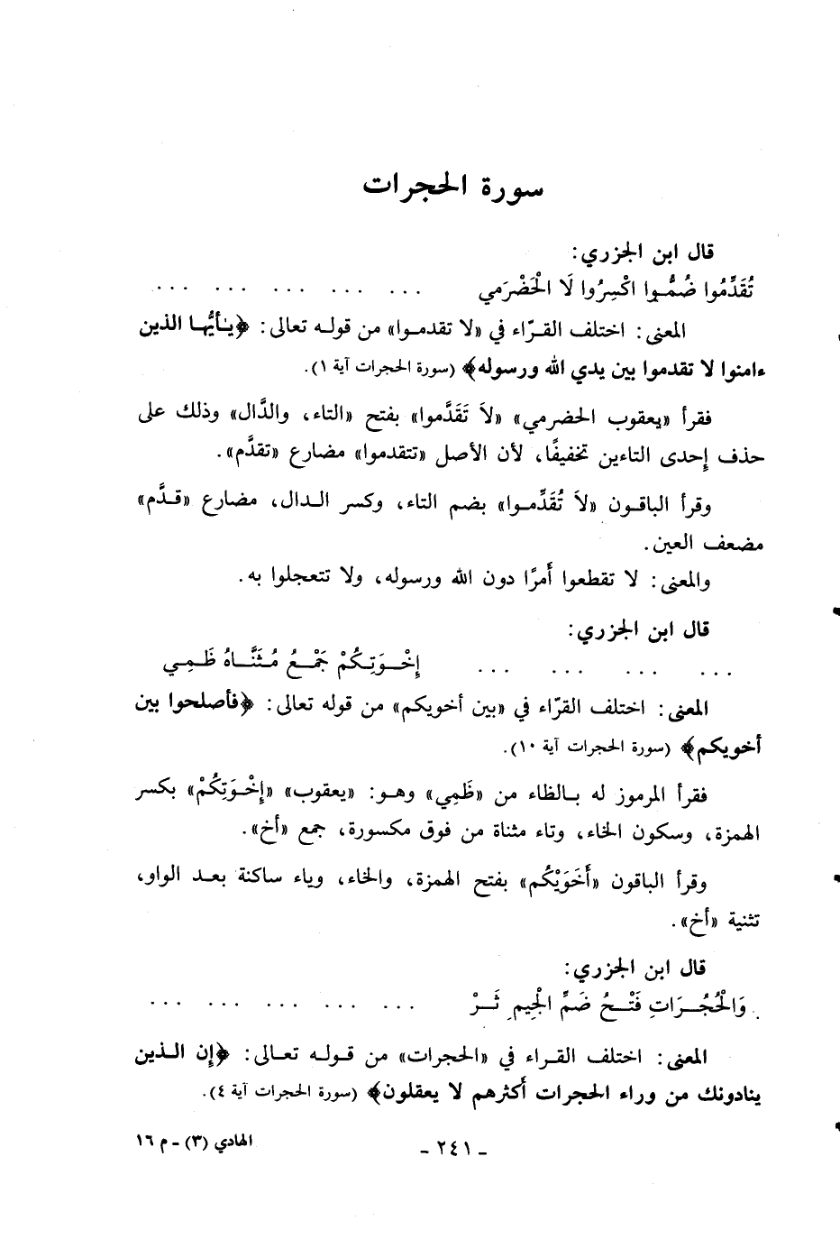 المعنى: اختلف القرّاء في «لا تُقَدِّمُوا» من قوله تعالى: يا أَيُّهَا الَّذِينَ آمَنُوا لا تُقَدِّمُوا بَيْنَ يَدَيِ اللَّهِ وَرَسُولِهِ (سورة الحجرات آية 1).