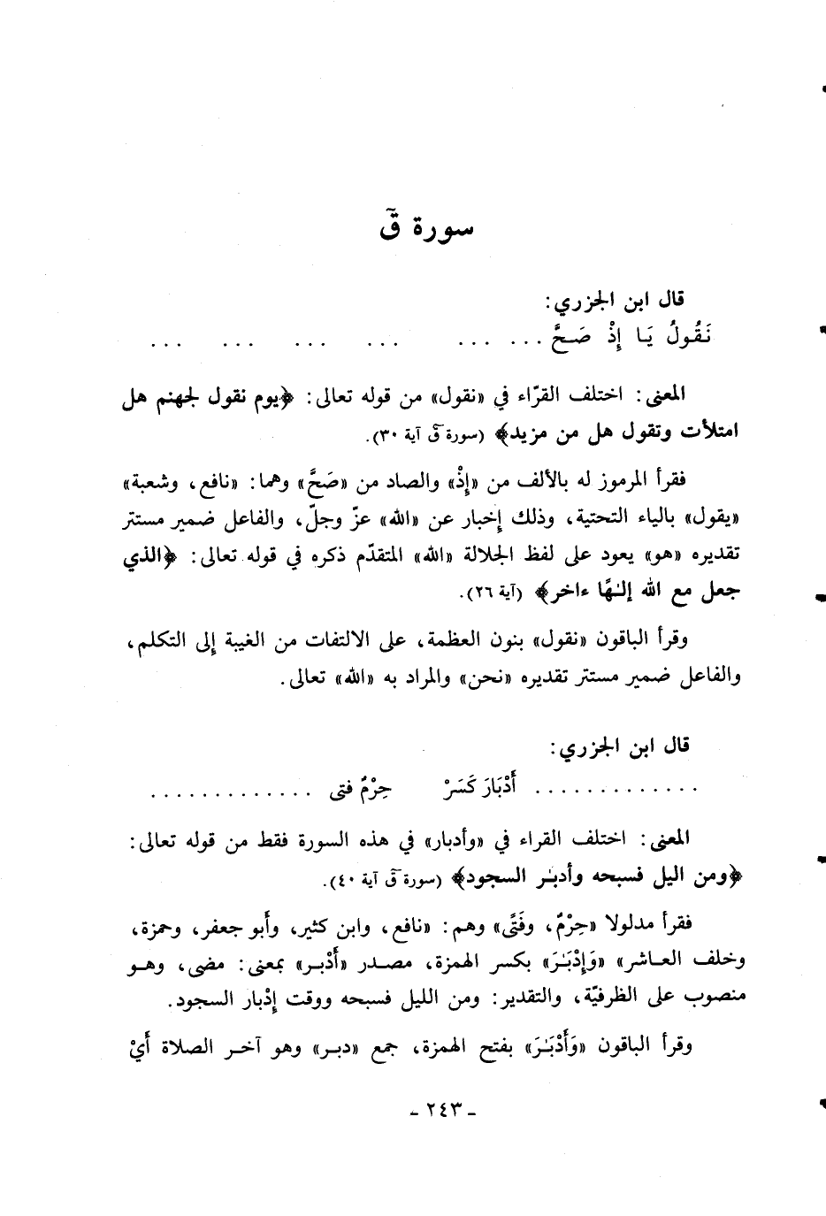 فقرأ مدلولا «حرم، وفتى» وهم: «نافع، وابن كثير، وأبو جعفر، وحمزة، وخلف العاشر» «وادبر» بكسر الهمزة، مصدر «أدبر» بمعنى: مضى، وهو منصوب على الظرفيّة، والتقدير: ومن الليل فسبحه ووقت إدبار السجود.