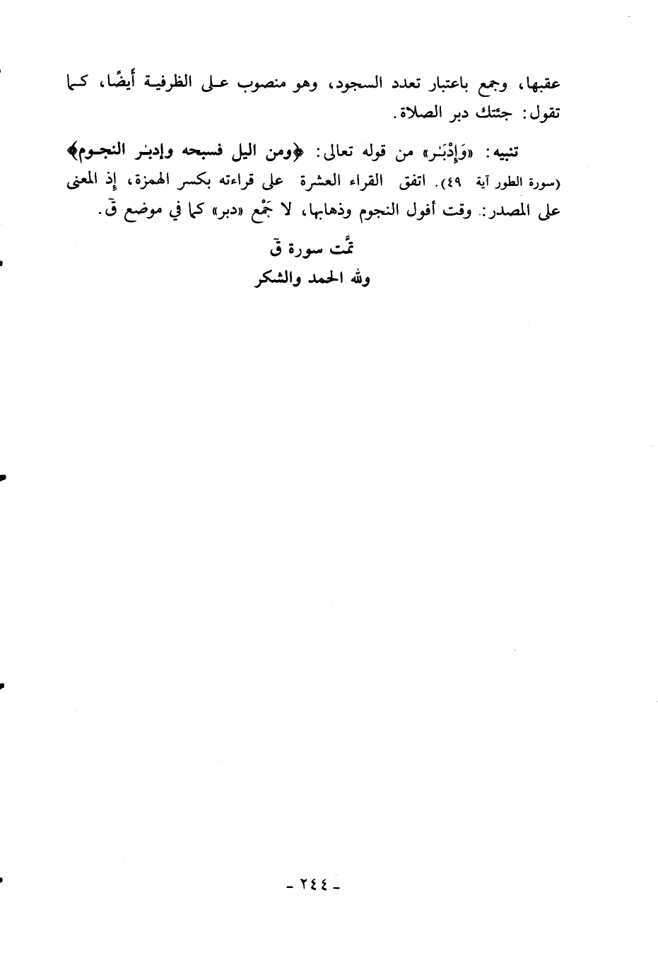 تنبيه: «وَإِدْبارَ» من قوله تعالى: وَمِنَ اللَّيْلِ فَسَبِّحْهُ وَإِدْبارَ النُّجُومِ (سورة الطور آية 49). اتفق القراء العشرة على قراءته بكسر الهمزة، إذ المعنى على المصدر: وقت أفول النجوم وذهابها، لا جمع «دبر» كما في موضع ق.