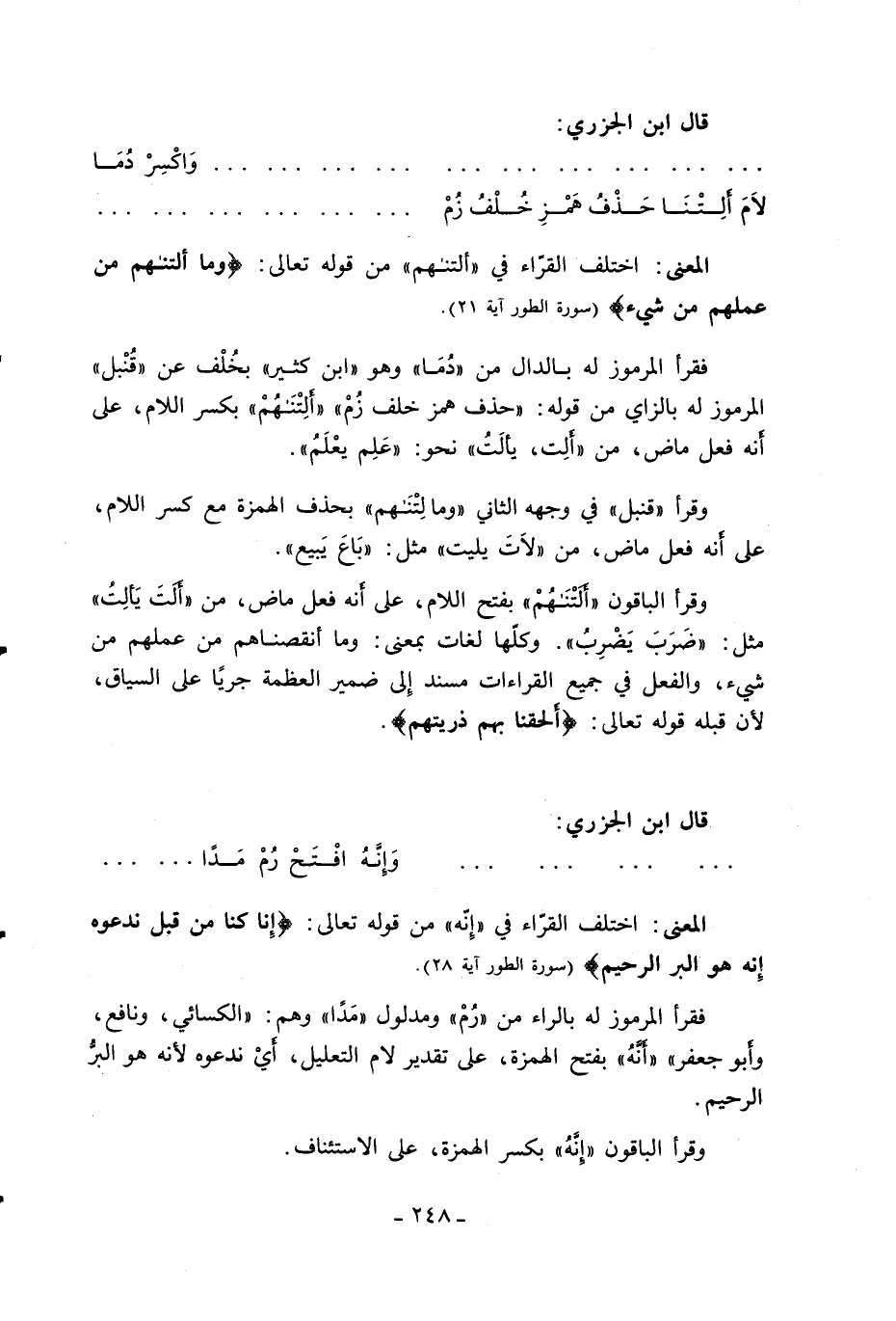 وقرأ الباقون «ألتنهم» بفتح اللام، على أنه فعل ماض، من «ألت يألت» مثل: «ضرب يضرب». وكلّها لغات بمعنى: وما أنقصناهم من عملهم من شيء، والفعل في جميع القراءات مسند إلى ضمير العظمة جريا على السياق، لأن قبله قوله تعالى: أَلْحَقْنا بِهِمْ ذُرِّيَّتَهُمْ.