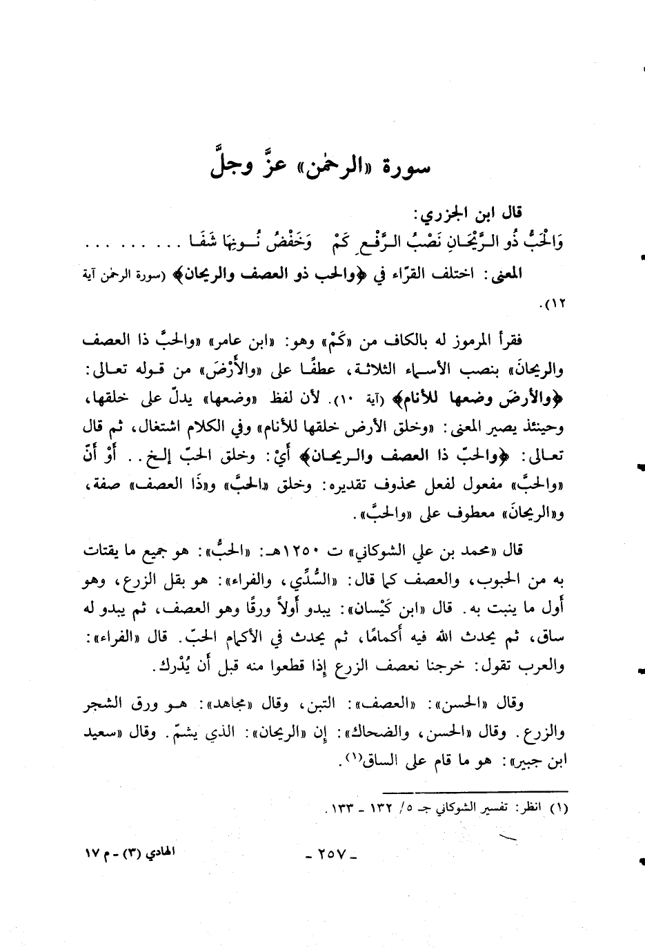 قال «محمد بن علي الشوكاني» ت 1250 هـ: «الحبّ»: هو جميع ما يقتات به من الحبوب، والعصف كما قال: «السّدّي، والفراء»: هو بقل الزرع، وهو أول ما ينبت به. قال «ابن كيسان»: يبدو أولا ورقا وهو العصف، ثم يبدو له ساق، ثم يحدث الله فيه أكماما، ثم يحدث في الأكمام الحبّ. قال «الفراء»: