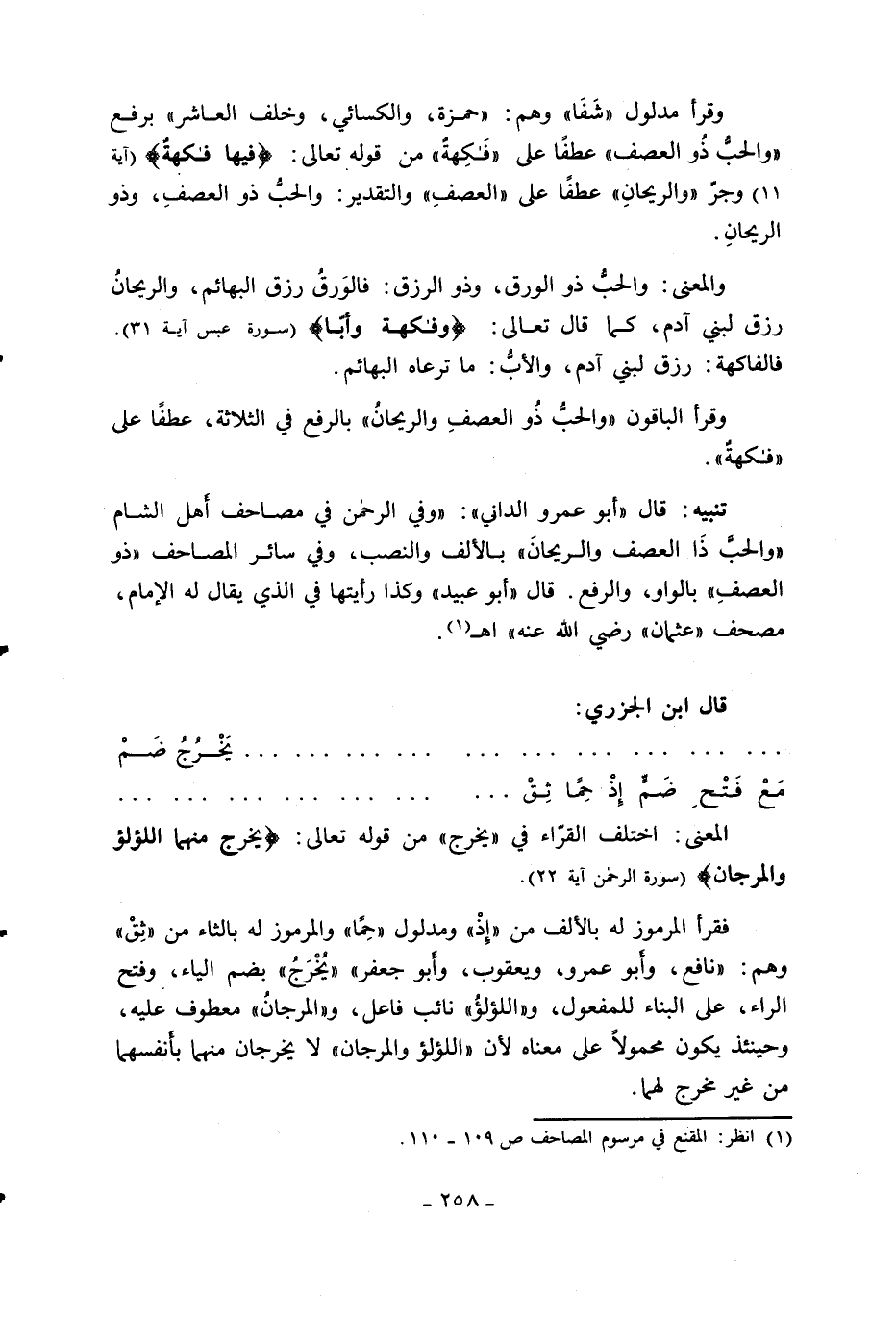 تنبيه: قال «أبو عمرو الداني»: «وفي الرحمن في مصاحف أهل الشام «والحبّ ذا العصف والريحان» بالألف والنصب، وفي سائر المصاحف «ذو العصف» بالواو، والرفع. قال «أبو عبيد» وكذا رأيتها في الذي يقال له الإمام، مصحف «عثمان» رضي الله عنه» اهـ «1».