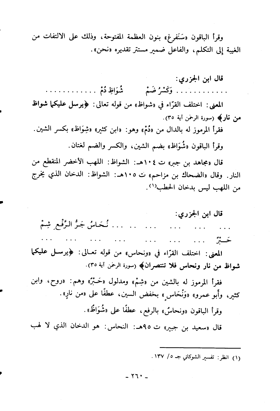 المعنى: اختلف القرّاء في «شواظ» من قوله تعالى: يُرْسَلُ عَلَيْكُما شُواظٌ مِنْ نارٍ (سورة الرحمن آية 35).