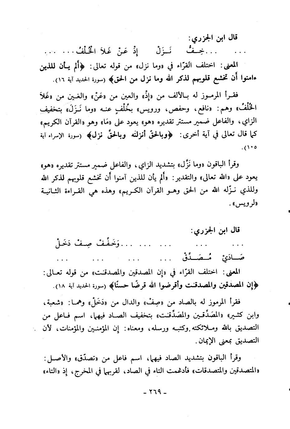 وقرأ الباقون «وما نزّل» بتشديد الزاي، والفاعل ضمير مستتر تقديره «هو» يعود على «الله تعالى» والتقدير: «ألم يأن للذين آمنوا أن تخشع قلوبهم لذكر الله وللذي نزّله الله من الحق وهو القرآن الكريم» وهذه هي القراءة الثانية «لرويس».
