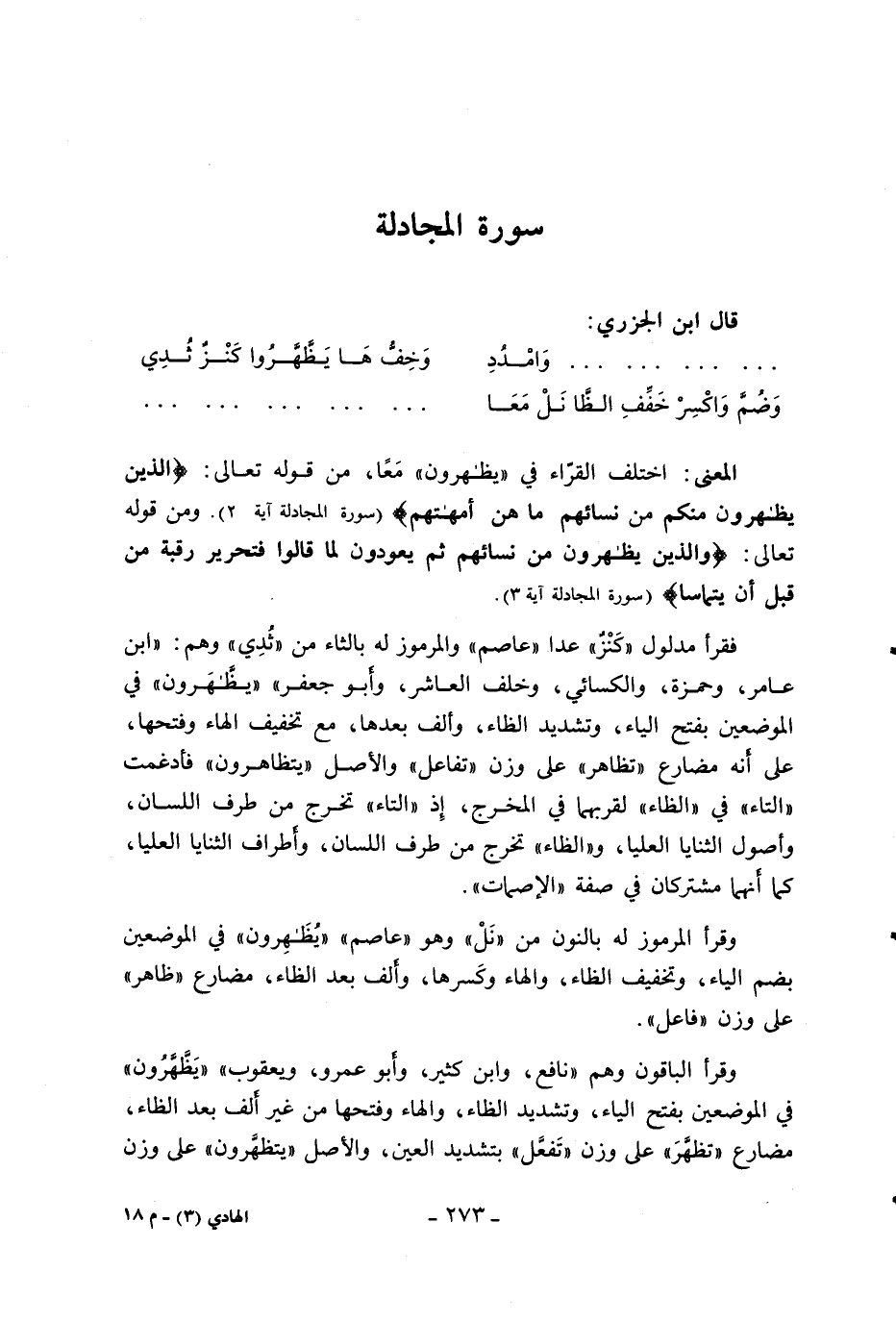 المعنى: اختلف القرّاء في «يُظاهِرُونَ» معا، من قوله تعالى: الَّذِينَ يُظاهِرُونَ مِنْكُمْ مِنْ نِسائِهِمْ ما هُنَّ أُمَّهاتِهِمْ (سورة المجادلة آية 2). ومن قوله تعالى: وَالَّذِينَ يُظاهِرُونَ مِنْ نِسائِهِمْ ثُمَّ يَعُودُونَ لِما قالُوا فَتَحْرِيرُ رَقَبَةٍ مِنْ قَبْلِ أَنْ يَتَمَاسَّا (سورة المجادلة آية 3).