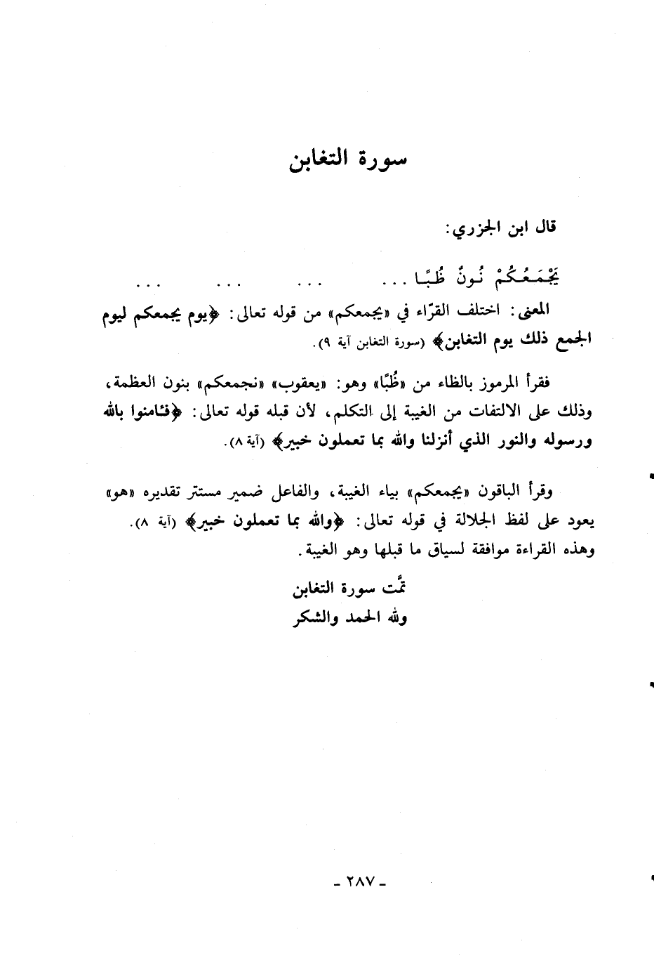 فقرأ المرموز بالظاء من «ظبا» وهو: «يعقوب» «نجمعكم» بنون العظمة، وذلك على الالتفات من الغيبة إلى التكلم، لأن قبله قوله تعالى: فَآمِنُوا بِاللَّهِ وَرَسُولِهِ وَالنُّورِ الَّذِي أَنْزَلْنا وَاللَّهُ بِما تَعْمَلُونَ خَبِيرٌ (آية 8).