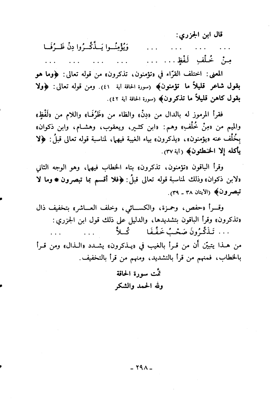 المعنى: اختلف القرّاء في «تؤمنون، تذكرون» من قوله تعالى: وَما هُوَ بِقَوْلِ شاعِرٍ قَلِيلًا ما تُؤْمِنُونَ (سورة الحاقة آية 41). ومن قوله تعالى: وَلا بِقَوْلِ كاهِنٍ قَلِيلًا ما تَذَكَّرُونَ (سورة الحاقة آية 42).