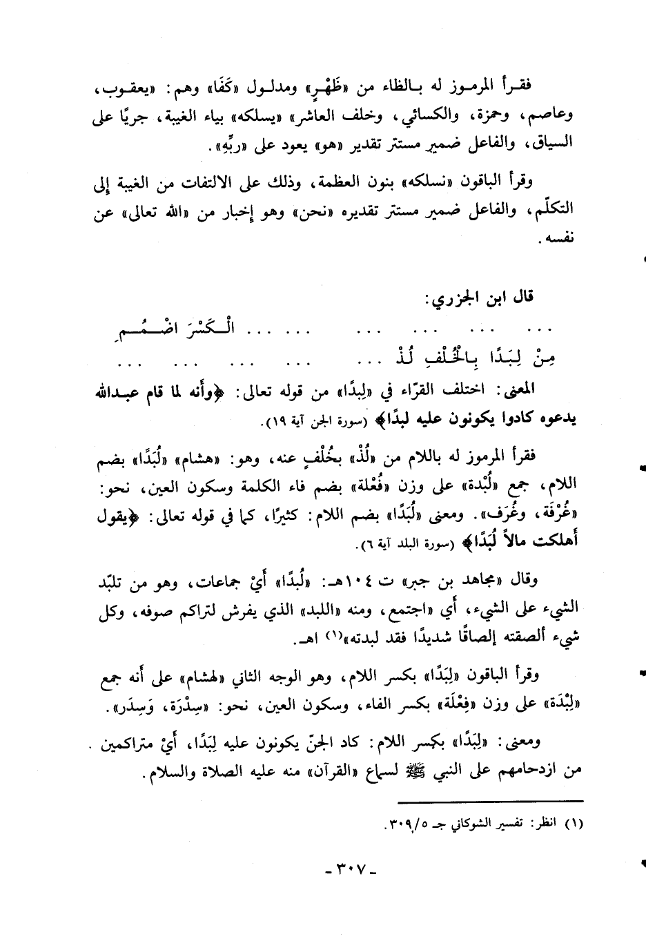 فقرأ المرموز له باللام من «لذ» بخلف عنه، وهو: «هشام» «لبدا» بضم اللام، جمع «لبدة» على وزن «فعلة» بضم فاء الكلمة وسكون العين، نحو: