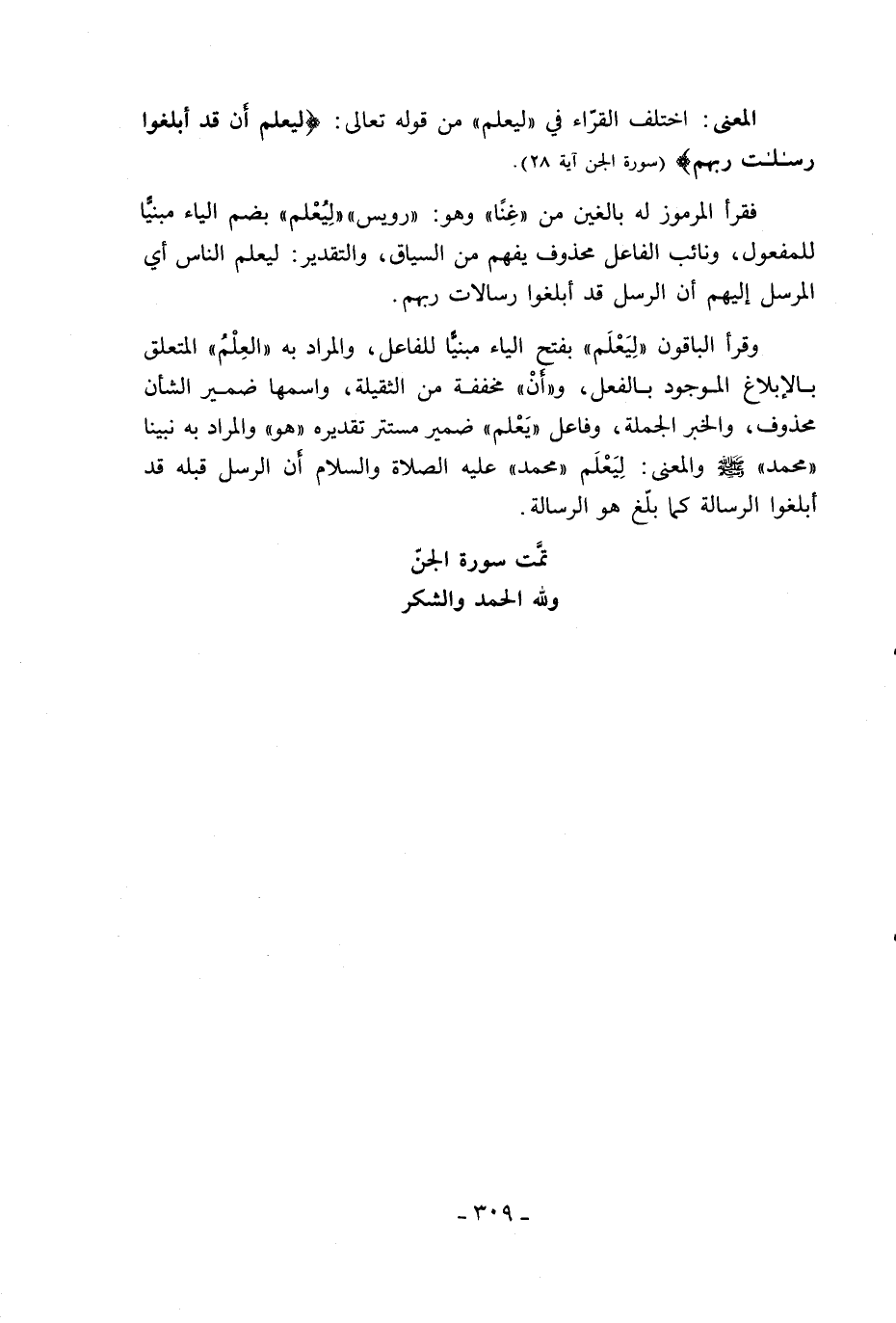 المعنى: اختلف القرّاء في «ليعلم» من قوله تعالى: لِيَعْلَمَ أَنْ قَدْ أَبْلَغُوا رِسالاتِ رَبِّهِمْ (سورة الجنّ آية 28).