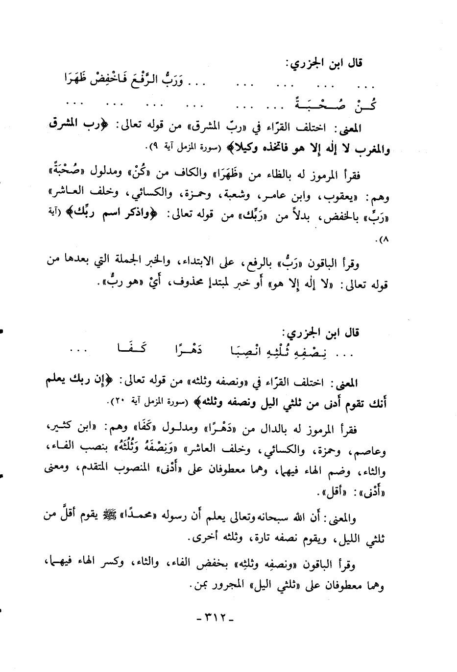 فقرأ المرموز له بالدال من «دهرا» ومدلول «كفا» وهم: «ابن كثير، وعاصم، وحمزة، والكسائي، وخلف العاشر» «ونصفه وثلثه» بنصب الفاء، والثاء، وضم الهاء فيهما، وهما معطوفان على «أدنى» المنصوب المتقدم، ومعنى «أدنى»: «أقل».