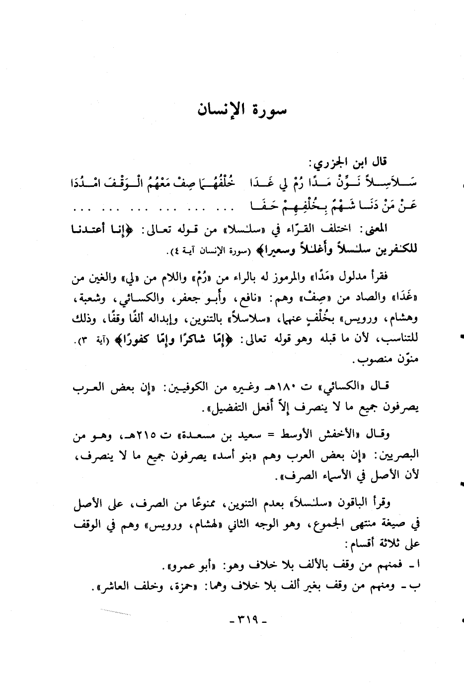 وقرأ الباقون «سلسلا» بعدم التنوين، ممنوعا من الصرف، على الأصل في صيغة منتهى الجموع، وهو الوجه الثاني «لهشام، ورويس» وهم في الوقف على ثلاثة أقسام: