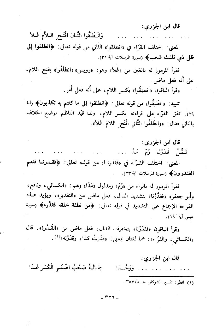 تنبيه: «انطلقوا» من قوله تعالى: انْطَلِقُوا إِلى ما كُنْتُمْ بِهِ تُكَذِّبُونَ (آية 29). اتفق القرّاء على قراءته بكسر اللام، ولذا قيّد الناظم موضع الخلاف بالثاني فقال: «وانطلقوا الثّاني افتح اللام غلا».