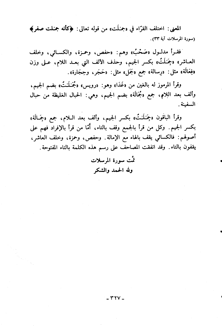 المعنى: اختلف القرّاء في «جملت» من قوله تعالى: كَأَنَّهُ جِمالَتٌ صُفْرٌ (سورة المرسلات آية 33).