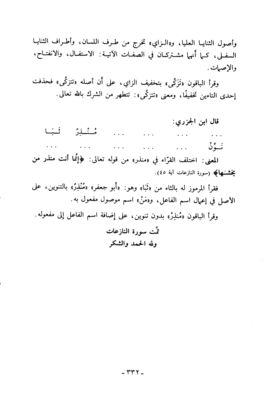 المعنى: اختلف القرّاء في «منذر» من قوله تعالى: إِنَّما أَنْتَ مُنْذِرُ مَنْ يَخْشاها (سورة النازعات آية 45).