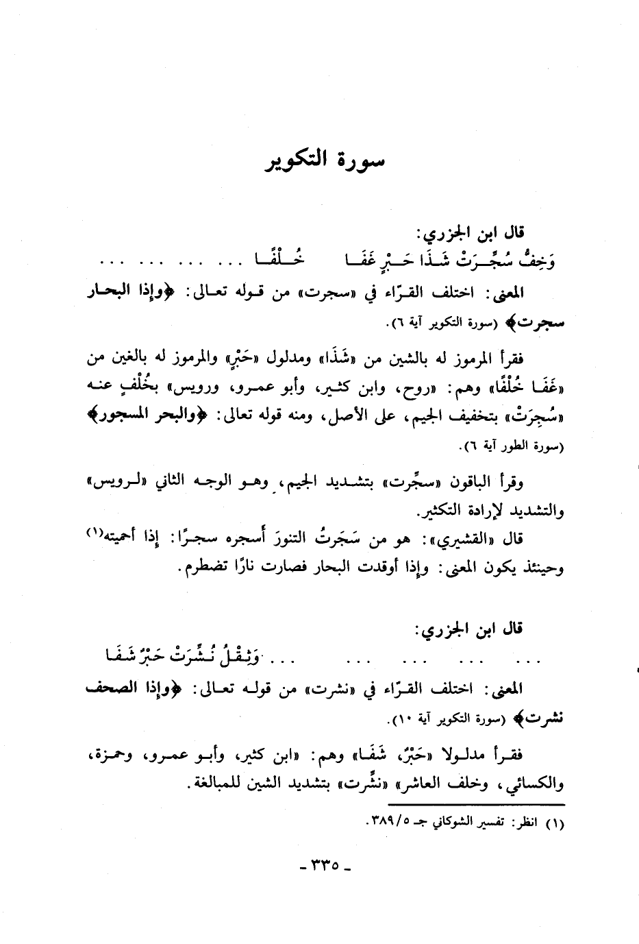 فقرأ المرموز له بالشين من «شذا» ومدلول «حبر» والمرموز له بالغين من «غفا خلفا» وهم: «روح، وابن كثير، وأبو عمرو، ورويس» بخلف عنه «سجرت» بتخفيف الجيم، على الأصل، ومنه قوله تعالى: وَالْبَحْرِ الْمَسْجُورِ (سورة الطور آية 6).