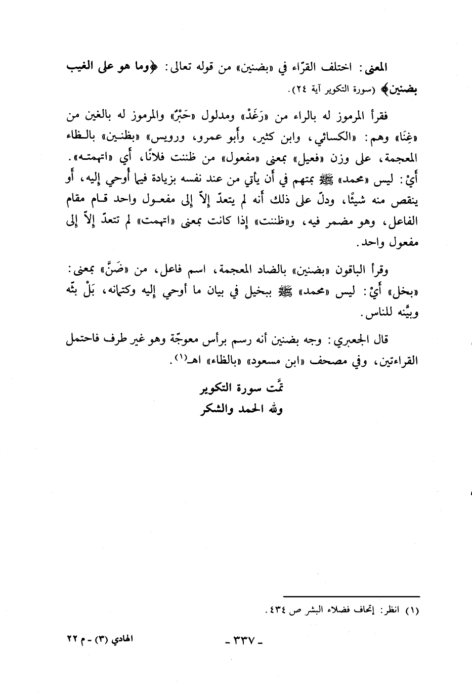 المعنى: اختلف القرّاء في «بضنين» من قوله تعالى: وَما هُوَ عَلَى الْغَيْبِ بِضَنِينٍ (سورة التكوير آية 24).