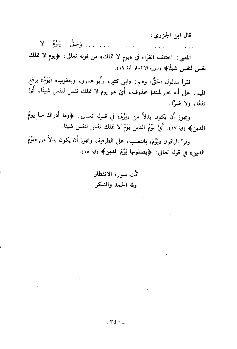 وقرأ الباقون «يوم» بالنصب، على الظرفية، ويجوز أن يكون بدلا من «يَوْمَ الدِّينِ» في قوله تعالى: يَصْلَوْنَها يَوْمَ الدِّينِ (آية 15).