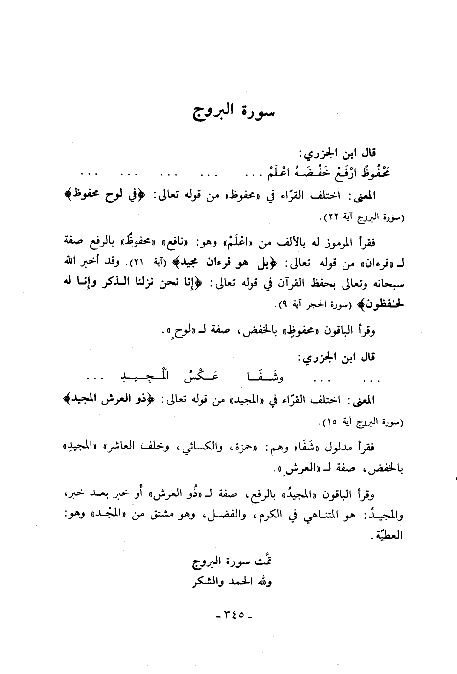 فقرأ مدلول «شفا» وهم: «حمزة، والكسائي، وخلف العاشر» «المجيد» بالخفض، صفة ل «العرش».