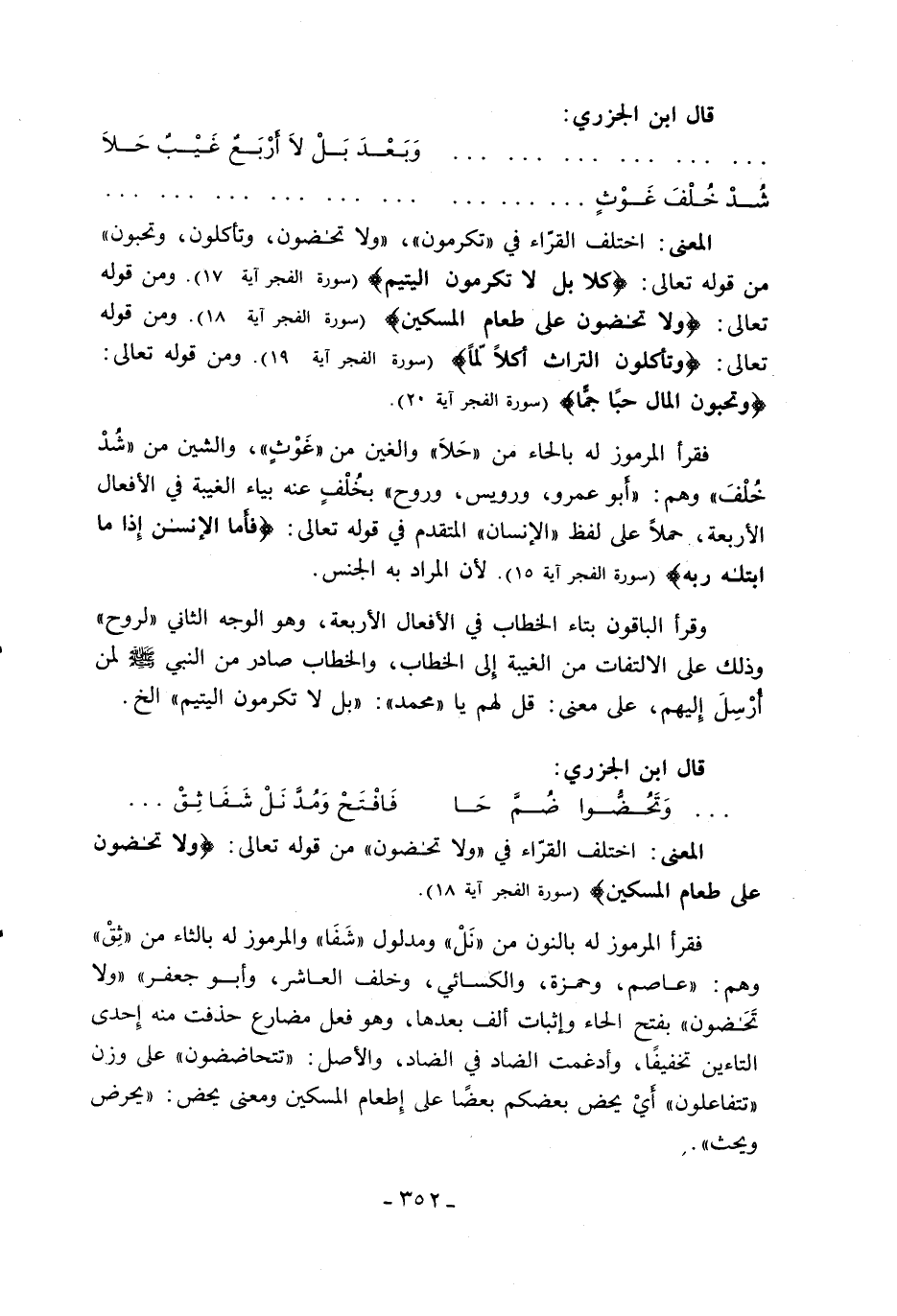 المعنى: اختلف القرّاء في «تكرمون»، «ولا تحضون، وتأكلون، وتحبون» من قوله تعالى: كَلَّا بَلْ لا تُكْرِمُونَ الْيَتِيمَ (سورة الفجر آية 17). ومن قوله تعالى: وَلا تَحَاضُّونَ عَلى طَعامِ الْمِسْكِينِ (سورة الفجر آية 18). ومن قوله تعالى: وَتَأْكُلُونَ التُّراثَ أَكْلًا لَمًّا (سورة الفجر آية 19). ومن قوله تعالى: