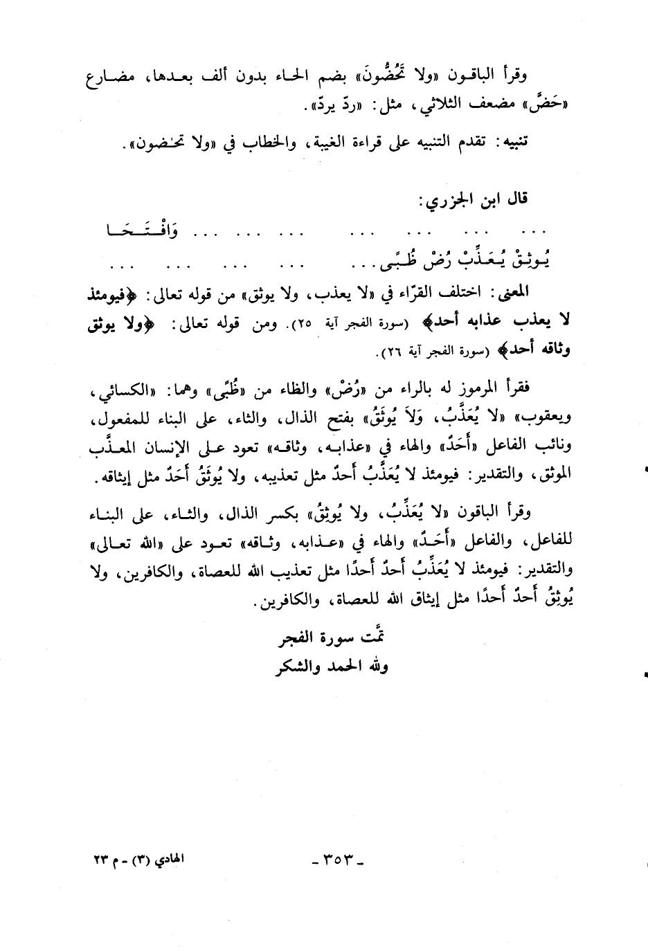 المعنى: اختلف القرّاء في «لا يعذب، ولا يوثق» من قوله تعالى: فَيَوْمَئِذٍ لا يُعَذِّبُ عَذابَهُ أَحَدٌ (سورة الفجر آية 25). ومن قوله تعالى: وَلا يُوثِقُ وَثاقَهُ أَحَدٌ (سورة الفجر آية 26).