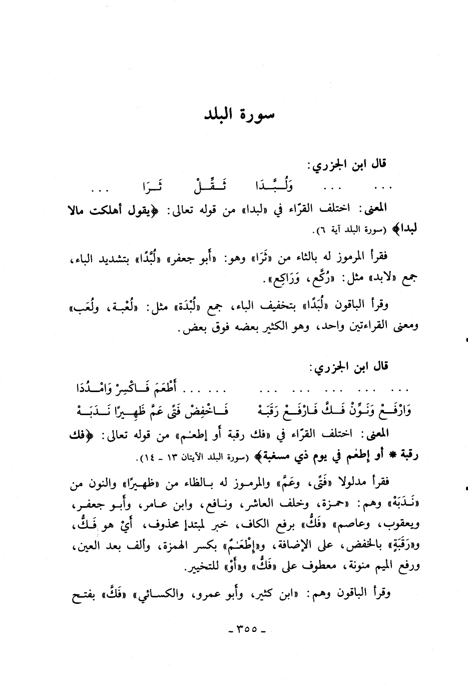 فقرأ مدلولا «فتى، وعمّ» والمرموز له بالظاء من «ظهيرا» والنون من «ندبه» وهم: «حمزة، وخلف العاشر، ونافع، وابن عامر، وأبو جعفر، ويعقوب، وعاصم» «فكّ» برفع الكاف، خبر لمبتدإ محذوف، أي هو فكّ، و «رقبة» بالخفض، على الإضافة، و «إطعام» بكسر الهمزة، وألف بعد العين، ورفع الميم منونة، معطوف على «فكّ» و «أو» للتخيير.