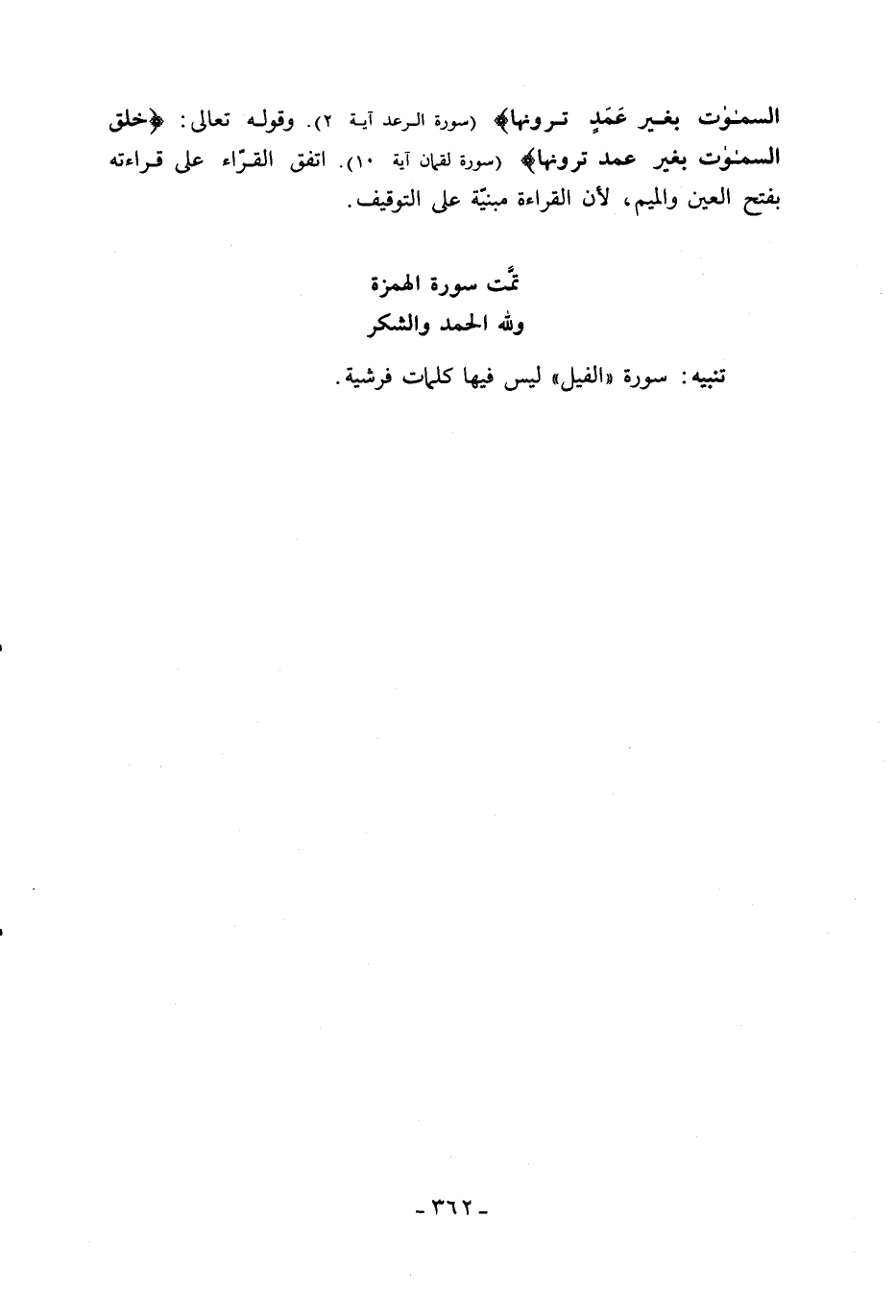 السَّماواتِ بِغَيْرِ عَمَدٍ تَرَوْنَها (سورة الرعد آية 2). وقوله تعالى: خَلَقَ السَّماواتِ بِغَيْرِ عَمَدٍ تَرَوْنَها (سورة لقمان آية 10). اتفق القرّاء على قراءته بفتح العين والميم، لأن القراءة مبنيّة على التوقيف.