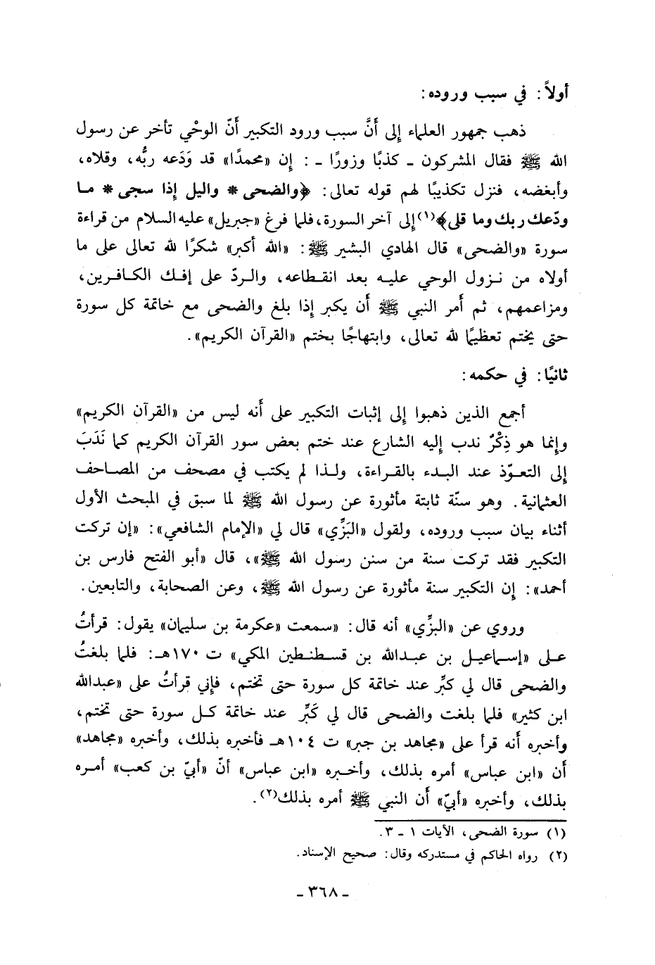 أجمع الذين ذهبوا إلى إثبات التكبير على أنه ليس من «القرآن الكريم» وإنما هو ذكر ندب إليه الشارع عند ختم بعض سور القرآن الكريم كما ندب إلى التعوّذ عند البدء بالقراءة، ولذا لم يكتب في مصحف من المصاحف العثمانية. وهو سنّة ثابتة مأثورة عن رسول الله صلى الله عليه وسلم لما سبق في المبحث الأول أثناء بيان سبب وروده، ولقول «البزّي» قال لي «الإمام الشافعي»: «إن تركت التكبير فقد تركت سنة من سنن رسول الله صلى الله عليه وسلم»، قال «أبو الفتح فارس بن أحمد»: إن التكبير سنة مأثورة عن رسول الله صلى الله عليه وسلم، وعن الصحابة، والتابعين.