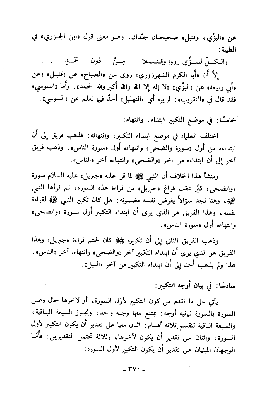 ومنشأ هذا الخلاف أن النبي صلى الله عليه وسلم لما قرأ عليه «جبريل» عليه السلام سورة «والضحى» كبّر عقب فراغ «جبريل» من قراءة هذه السورة، ثم قرأها النبي صلى الله عليه وسلم، وهنا نجد سؤالا يفرض نفسه مضمونه: هل كان تكبير النبي صلى الله عليه وسلم لقراءة نفسه، وهذا الفريق هو الذي يرى أن ابتداء التكبير أول سورة «والضحى» وانتهاءه أول «سورة الناس».
