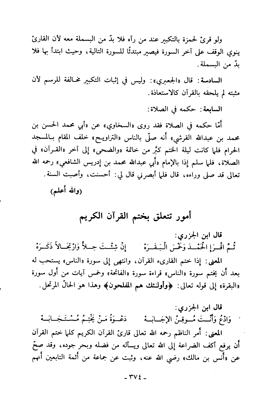 السادسة: قال «الجعبري»: وليس في إثبات التكبير مخالفة للرسم لأن مثبته لم يلحقه بالقرآن كالاستعاذة.